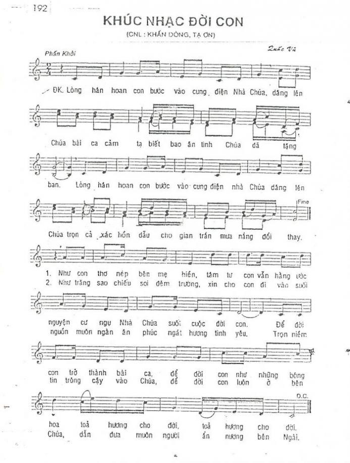 ĐK. Lòng hân hoan con bước vào cung điện Nhà Chúa. Dâng lên Chúa bài ca cảm tạ, biết bao ân tình Chúa đã tặng ban. Lòng hân hoan con bước vào cung điện nhà Chúa. Dâng lên Chúa trọn cả xác hồn, dẫu cho gian trần mưa nắng đổi thay.