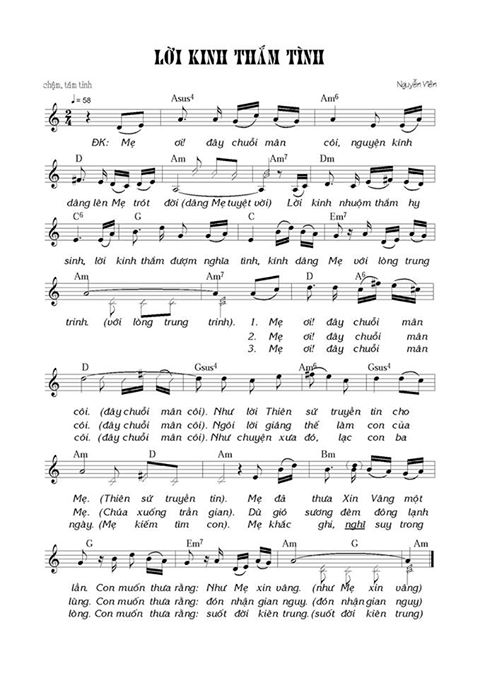 ĐK:Mẹ ơi! đây chuỗi Mân Côi nguyện kính dâng lên Mẹ trót đời( dâng Mẹ tuyệt vời) Lời kinh nhuộm thắm hy sinh, lời kinh thắm đượm nghĩa tình, kính dâng Mẹ với lòng trung trinh( với lòng trung trinh).