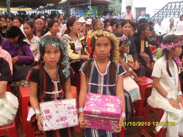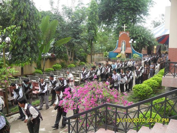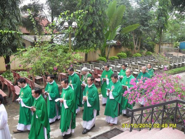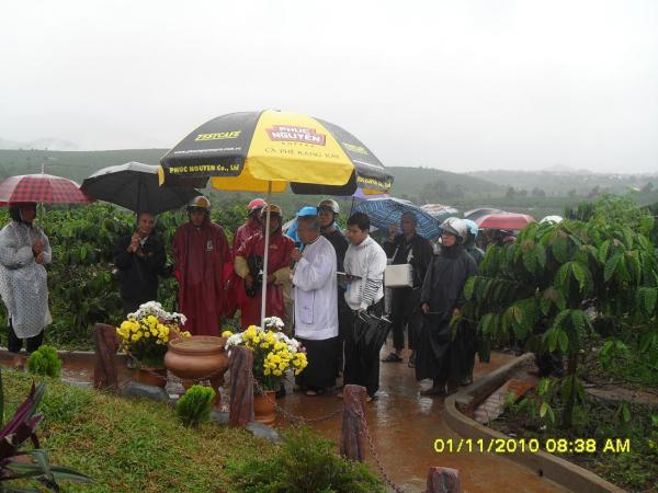Con đường mới mở trải sơ lớp đá, chưa kịp kết dính đã bị những cơn mưa kéo dài mấy ngày nay làm cho trơn trượt, len lỏi qua những hàng cà phê trĩu quả, chúng tôi có mặt dưới chân tượng đài Tổng lãnh thiên thần Micae – Đấng đánh bại sự dữ và 4 thiên thần đồng nhi thật sống động. Cha xứ Giuse đã cử hành nghi thức làm phép tượng và bày tỏ sự biết ơn đối với gia đình ông bà B. một gia đình giáo dân trong giáo xứ đã khởi xướng và quảng đại xây dựng nghĩa trang này, kịp dâng hiến cho giáo xứ trong ngày lễ các Thánh 1/11/2010.