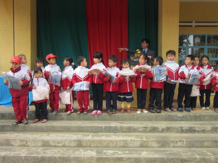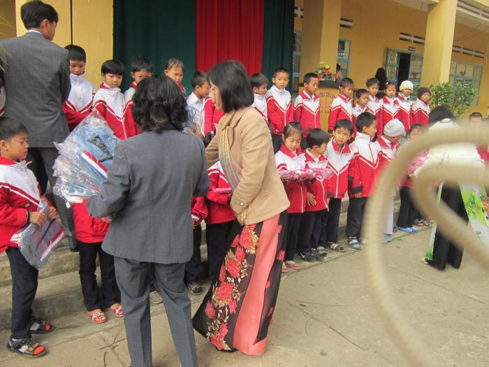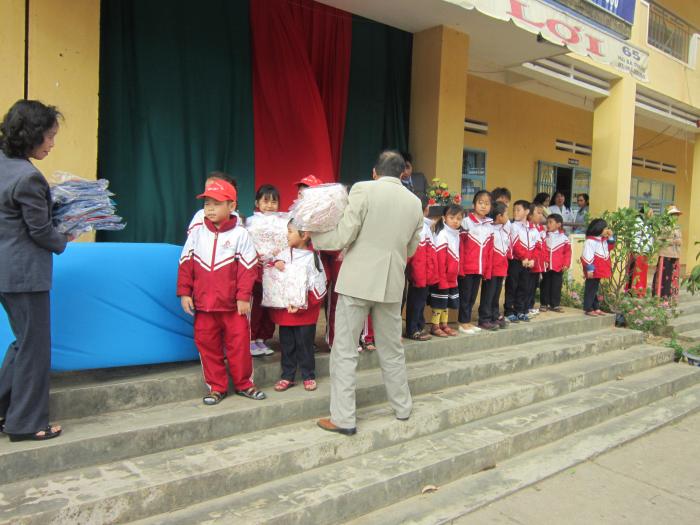 Sau lời giới thiệu có Nhóm thiện nguyện Thánh Ca Việt Nam đến hổ trợ tặng quà áo ấm cho các em học sinh, Thầy gọi tên lần lượt từng khối lớp 1, 2, 3, 4, 5, các em có trong danh sách xét duyệt của Nhà trường lên sân trường nhận áo ấm...