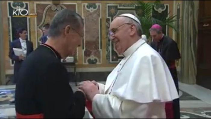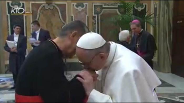 Đức Tân Giáo Hoàng François hôn nhẫn Đức Hồng Y Phạm Minh Mẫn. Một cử chỉ vô tiền khoáng hậu, một bài học khiêm nhượng của một chủ chăn