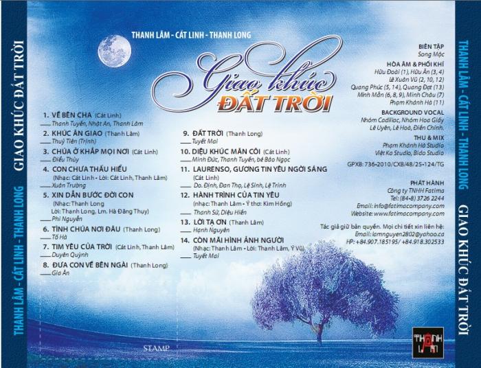 Xin giới thiệu Album " Giao Khúc Đất Trời " với sự kết hợp ngẫu nhiên của 3 Nhạc sỹ Thanh Lâm - Cát Linh - Thanh Long tạo nên một Album rất đặc biệt cùng các ca khúc ca ngợi tình yêu thương của Thiên Chúa dành cho chúng con thật to lớn biết nhường nào... để rồi trong lặng thầm chúng con xin dâng dâng lên Ngài lời nguyện xin cho chúng con sống một cuộc đời siêu nhiên, mạnh mẽ làm điều thiện và kiên quyết trở nên Thánh.