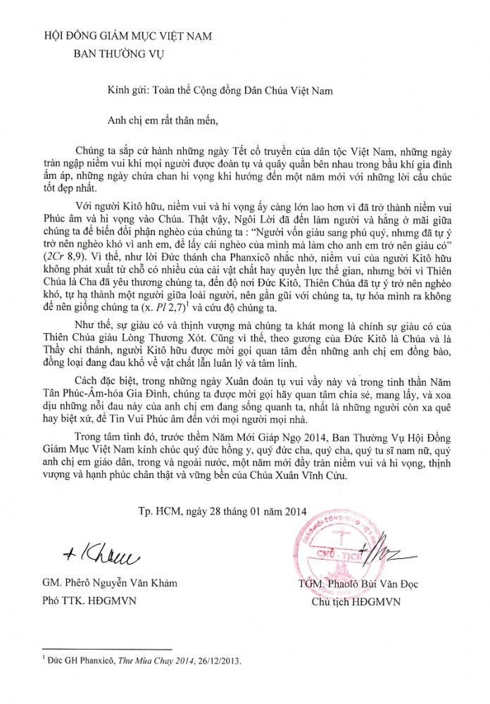 Thư chúc Tết của Ban Thường vụ Hội Đồng Giám Mục Việt Nam