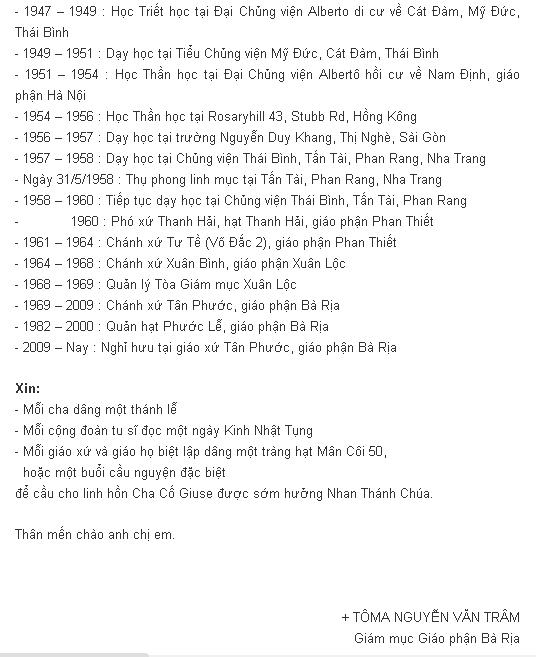 Chúng con cậy vì Danh Chúa nhân từ, cho linh hồn Cha Cố Giuse được lên chốn nghỉ ngơi,hằng xem thấy mặt Đức Chúa Trời sáng láng vui vẻ vô cùng Amen.