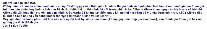 Cuộc đời sẽ đẹp biết bao khi mà mỗi thành viên trong gia đình biết từ bỏ ý riêng để sống có trách nhiệm với gia đình. Gia đình sẽ không có khổ đau nếu mỗi người biết sống hy sinh cho gia đình, biết làm việc để đem lại niềm vui và hạnh phúc cho gia đình. Và cuộc đời sẽ đẹp biết bao khi các gia đình Công Giáo biết đặt ý Chúa trên mọi ý hướng cá nhân để vì Chúa họ sống yêu thương và có trách nhiệm với nhau.