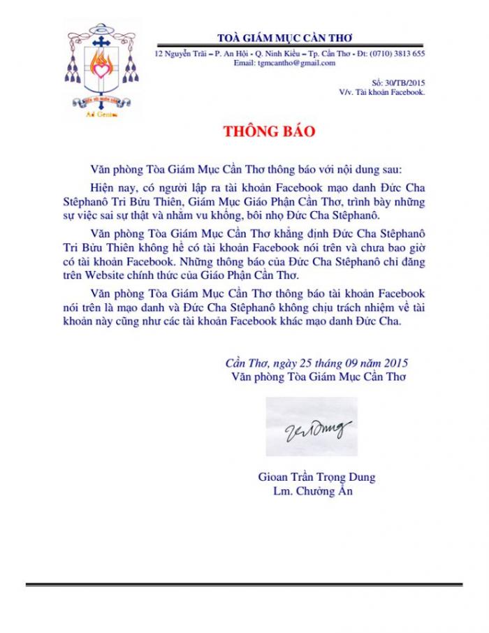 Văn phòng Tòa Giám Mục Cần Thơ thông báo với nội dung sau: