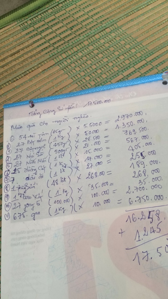 Sau đây là danh sách đóng góp của các thành viên cũng như các nhà hảo tâm:- chú Minh: 2.000.000 đ
