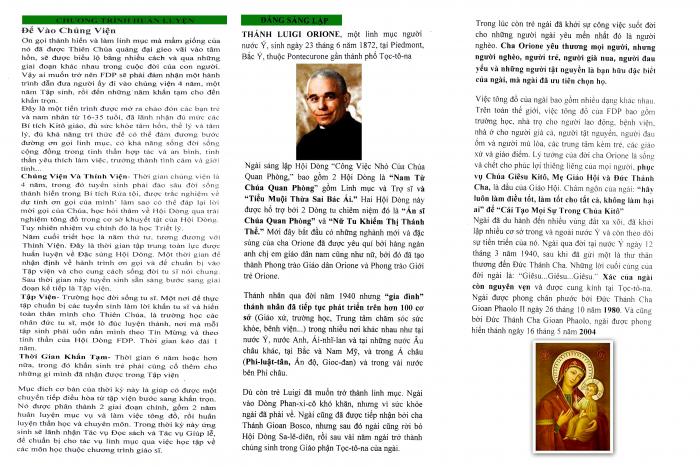 Thánh LUIGI ORIONE, một linh mục người nước Ý, sinh ngày 23 tháng 06 năm 1872, tại Piedmont, Bắc Ý, thuộc Pontecurone gần thành phố Tọc-tô-na. Ngài sáng lập Hội dòng “Công Việc Nhỏ Của Chúa Quan Phòng” bao gồm 2 Hội dòng là “Nam Tử Chúa Quan Phòng” gồm Linh mục và trợ sĩ và “Tiểu Muội Thừa Sai Bác Ái.” Hai Hội Dòng này được hỗ trợ bởi 2 Dòng tu chiêm niệm đó là “Ẩn sĩ Chúa Quan Phòng” và “Nữ tu Khiếm Thị Thánh Thể”.