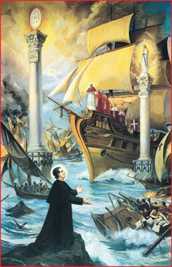 Thánh Gioan Bosco có một giấc mơ đẹp trong đó ngài thấy quang cảnh như sau. Ngài thấy một vùng biển rộng, và trên biển ngài thấy có nhiều con tàu, tất cả trong tình trạng chiến đấu. Và ngài thấy nhô cao trên mặt biển là hai cột trụ vĩ đại, một cái lớn và một cái nhỏ hơn, ở khá gần nhau. Trên đầu một cột trụ là một Bánh Thánh lớn, tại chân tượng có ghi: “Ơn Cứu Độ các Tín Hữu.” Gần với cột này là cột thứ hai, trên chóp cột có Thánh Tượng của Đức Trinh Nữ Hồng Phúc, và tại chân tượng có ghi : “Đấng Phù hộ các giáo hữu.” Ở giữa hai cột này, Thánh Gioan Bosco thấy một chiếc tàu uy nghi dường như là tâm điểm cho các tàu khác tấn công. Đức Giáo Chủ đứng tại tay lái của con tàu uy nghi này. Có một cuộc tấn công dữ dội nhắm vào con tàu này, và các tàu địch đã sử dụng mọi cách để cố gắng đánh đắm con tàu của Đức Giáo Chủ, khiến con tàu trở nên méo mó, biến dạng và đầy thương tích nhưng không bị chìm. Trong lúc đó, Đức Giáo Chủ đang nỗ lực hết sức để lái con tàu về hướng hai cột trụ vĩ đại. Ngài biết rằng nếu ngài có thể neo con tàu giữa hai cột này, thì các tàu địch sẽ không còn có thể gây nguy hại gì đáng kể cho con tàu của ngài được nữa. Nhưng các tàu địch đánh phá dữ dội, gắng sức ngăn chận Đức Giáo Chủ đạt đến mục tiêu. Tuy nhiên, sau cùng thì Đức Giáo Chủ cũng thành công, neo được con tàu của mình ở giữa hai cột trụ vĩ đại đó. Con tàu được neo một bên vào Mẹ Maria và bên kia vào Chúa Giêsu Thánh Thể.