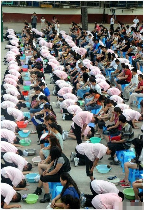 250 bạn học sinh đã quỳ gối cúi lạy và rửa chân cho bố mẹ tại thao trường trường thực nghiệm Kiên Trung, thành phố Lạc Dương tỉnh Hà Nam, Trung Quốc,