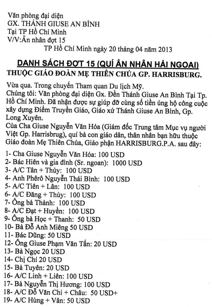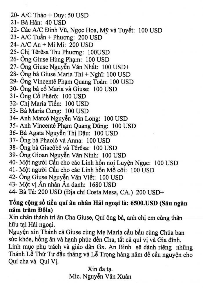 Chủ đề: Danh sách ân nhân Hải ngoại thuộc Giáo đoàn Mẹ Thiên Chúa Gp. Harrisburg.