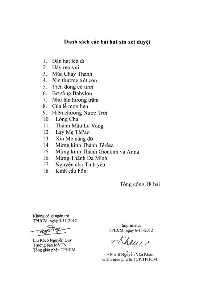 Hôm nay tôi xin được phép tiếp tục gửi lên một số bài hát đã được giáo quyền chuẩn thuận, sửa duyệt và cho phép sử dụng trong phụng vụ. Xin chân thành cảm ơn !