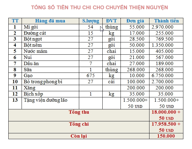 Danh sách đóng góp của Quý vị ân nhân, chi tiết thu chi cho chuyến đi thiện nguyện và một vài hình ảnh trong chuyến đi. |