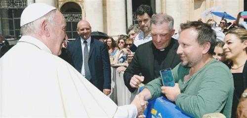 Trong buổi tiếp kiến chung tại Quảng trường Thánh Phêrô ngày 21 tháng 6, ông Sébastien Poncelet và linh mục Geoffroy de la Tousche, cha sở họ đạo Thánh Gioan Phaolô II, Dieppe, vùng Normandie.