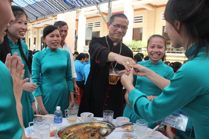 và đúng như câu khẩu hiệu của ngài, "NGÀI YÊU THƯƠNG HỌ ĐẾN CÙNG" ĐGM đã đi từng bàn một ngài rất thân thiện với mọi người...