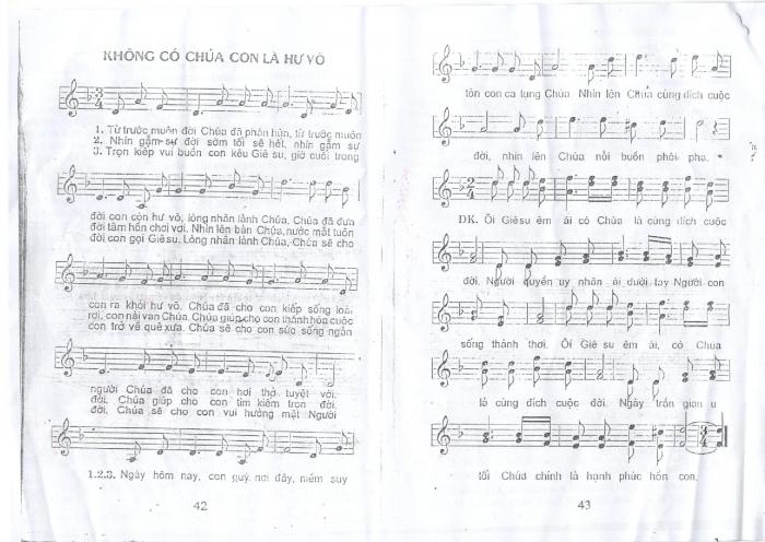 Đã từ lâu em có nghe bài hát: “Không có Chúa con là hư vô” mà có câu đầu là: “Từ trước muôn đời Chúa đã phán hứa, từ trước muôn đời con còn hư vô. Lòng nhân lành Chúa….”. Nếu anh chị em có bản PDF và Mp3 thì cho em xin. Địa chỉ Mail của em là: Duyhienserver@gmail.com