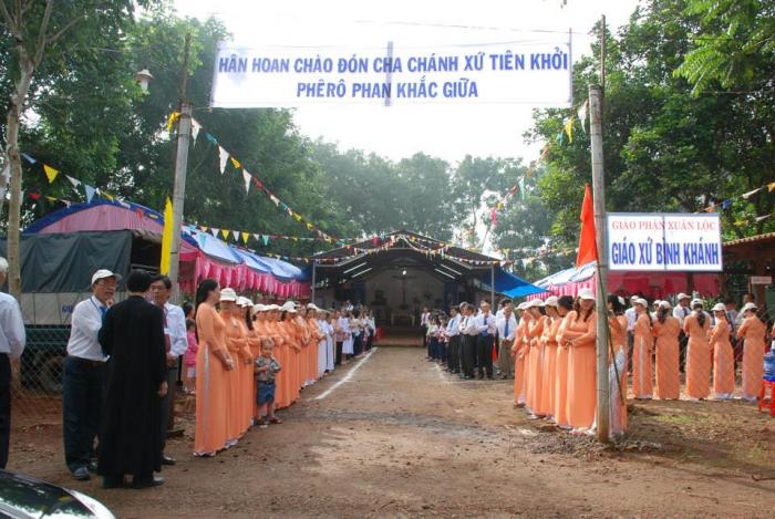 Từ thị xã Long Khánh - Đồng Nai đi vào khoảng 3km về bên trái ngay từ ngã ba Bình Lộc chúng ta sẽ gặp một giáo xứ non trẻ mang tên Bình Khánh. Từ bao năm nay, chưa có một nhà thờ nào được xây dựng trên mãnh đất Bình Lộc với 1017 giáo dân này. Với hàng loạt khu công nghiệp đang mọc lên thì nay mai nữa thôi giáo xứ chúng tôi sẽ đón thêm thật nhiều giáo dân về đây sinh sống. Tuy được công nhận là giáo xứ vào ngày 15/9/2010 nhưng đến nay cơ sở vật chất của giáo xứ hầu như không có gì ngoài một khung tiền chế bằng gỗ và sắt trong không. Ngày 15/9/2013 giáo xứ rất vui mừng đón cha Phêrô Phan Khắc Giữa là cha tiên khởi về quản nhiệm giáo xứ nhưng hiện nay cha xứ phải sống tạm ở . . . container. Từ ngày về giáo xứ với bao nhiều khó khăn, thiếu thốn nhưng cha Phêrô luôn quan tâm và chăm lo cho cuộc sống của giáo dân trong giáo xứ như: thăm hỏi người khó khăn bệnh tật, phát quà cho trẻ em nhân dịp trung thu, mở lớp dạy tiếng anh miễn phí cho học sinh, trao học bổng cho học sinh và sinh nghèo có thành tích học tập tốt,… Với lòng nhiệt thành sẵn có cha xứ cũng đang chuẩn bị cho việc xây dựng nhà thờ Bình Khánh để được thờ phượng Chúa chu đáo hơn. Chúng tôi tin rằng trong nay mai sẽ có một ngôi thánh đường được mọc lên trên đất thánh Bình Lộc đẽ thoả lòng mong mỏi bao năm nay của bà con giáo dân trong giáo xứ. Cầu xin ngôi hai Thiên Chúa lắng nghe và nhận lời chúng con, rất mong quý ông bà và anh chị em khắp nơi hợp ý cầu nguyện cho giáo xứ chúng tôi.