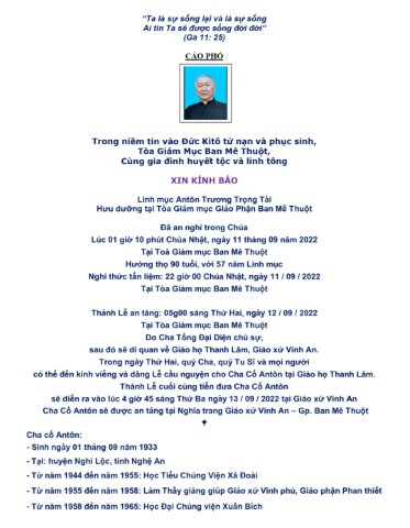 Cha Cố Antôn Trương Trọng Tài do tuổi cao sức yếu, Cha đã an nghỉ trong Chúa vào lúc 01 giờ 10 phút ngày 11.9.2022, tại Nhà hưu dưỡng Tòa Giám mục Ban Mê Thuột. Hưởng thọ 90 tuổi, với 57 năm Linh mục.