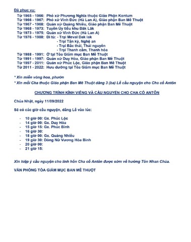 Thánh Lễ cuối cùng tiễn đưa Cha Cố Antôn sẽ diễn ra vào lúc 4 giờ 45 sáng thứ Ba ngày 13.9.2022 tại Nhà thờ Giáo xứ Vinh An. Sau đó, Cha Cố Antôn sẽ được an táng tại Nghĩa trang Giáo xứ Vinh An – Gp. Ban Mê Thuột.