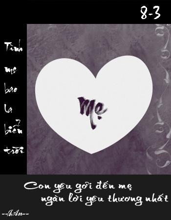 Mẹ! Con chưa bao giờ thổ lộ lòng mình ra với mẹ rằng" Con yêu mẹ biết bao nhiêu vì thường ngày trông con lạnh lùng lắm. Nhưng mẹ ơi đó là vẻ bề ngoài của con, còn thực sự trong tận đáy lòng con yêu mẹ nhiều lắm". Ngày phụ nữ 8 - 3 đến rồi con chúc mẹ luôn mạnh khoẻ, vui tươi, hạnh phúc và trẻ mãi. Con mãi yêu Mẹ- Mẹ tình yêu của con.